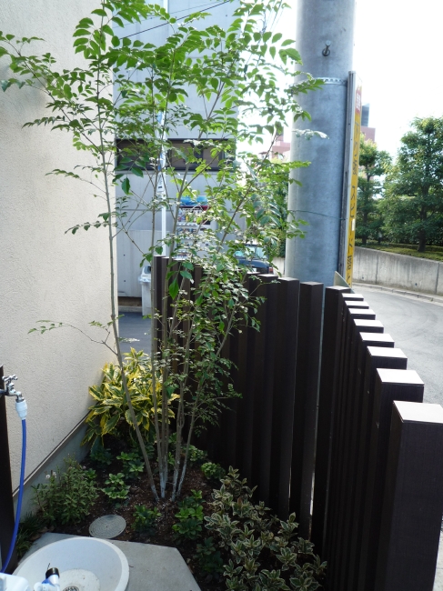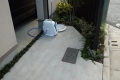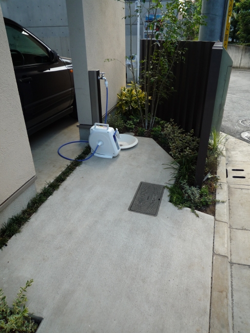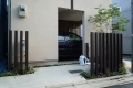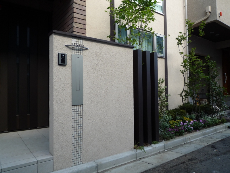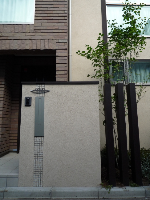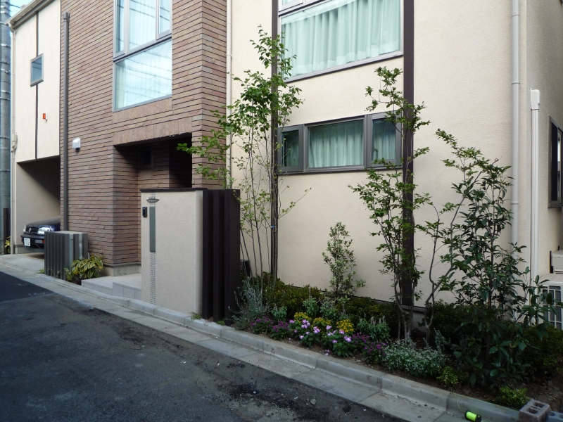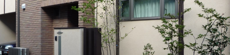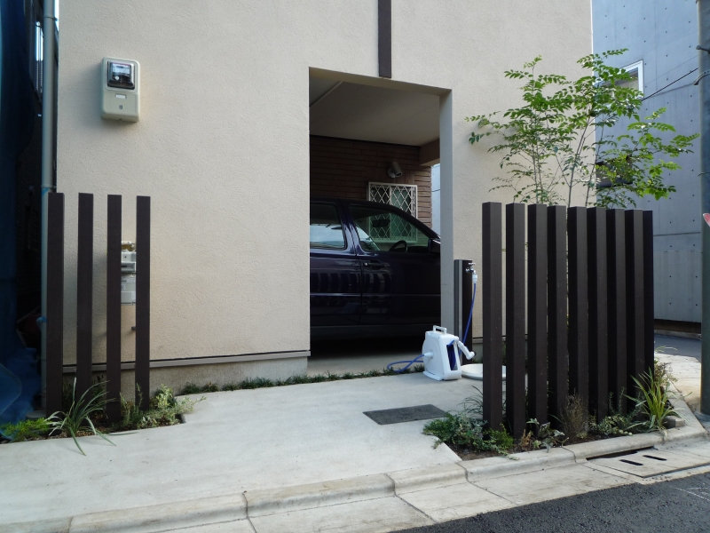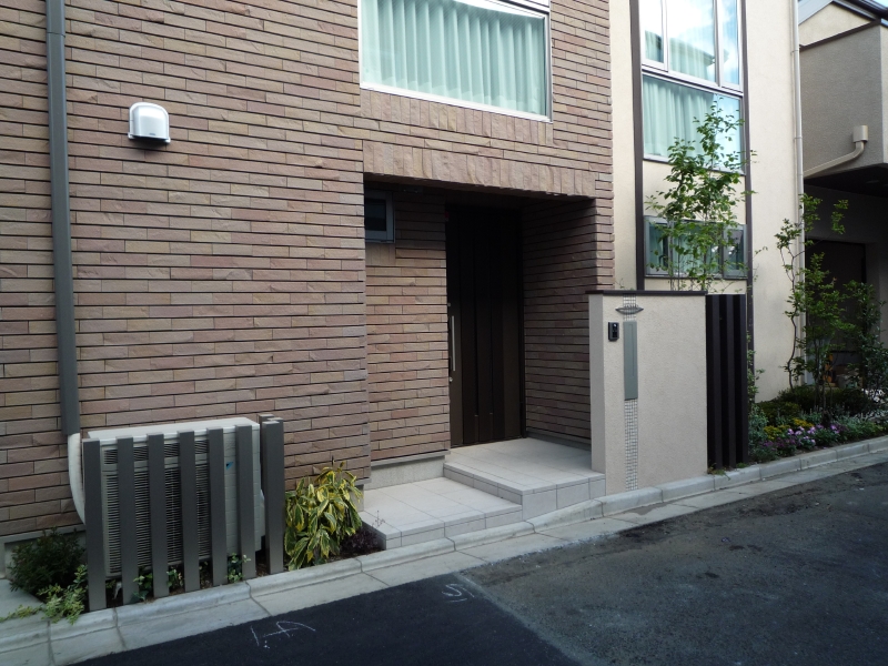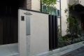 都内渋谷区の角地に建つT様邸。お土地柄敷地いっぱいに建物が建つということで、エクステリアとして何が出来るのかご相談を頂きました。最近はT様のように道路と建物が接近していて、駐車場は建物の内部に組込むビルトインタイプが多くなっています。当然玄関と道路も近く門袖壁を立てるのもひと工夫必要になります。二つの道路がぶつかる部分は近隣のゴミ集積所となっていて、電柱や消火栓もあるのでここをどう処理するかがデザインのポイントとなりました。